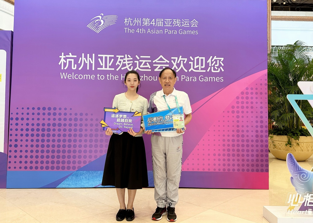 ▲王杭晨(左)采访杭州第4届亚残运会最高龄技术官员——78岁的张振翼。